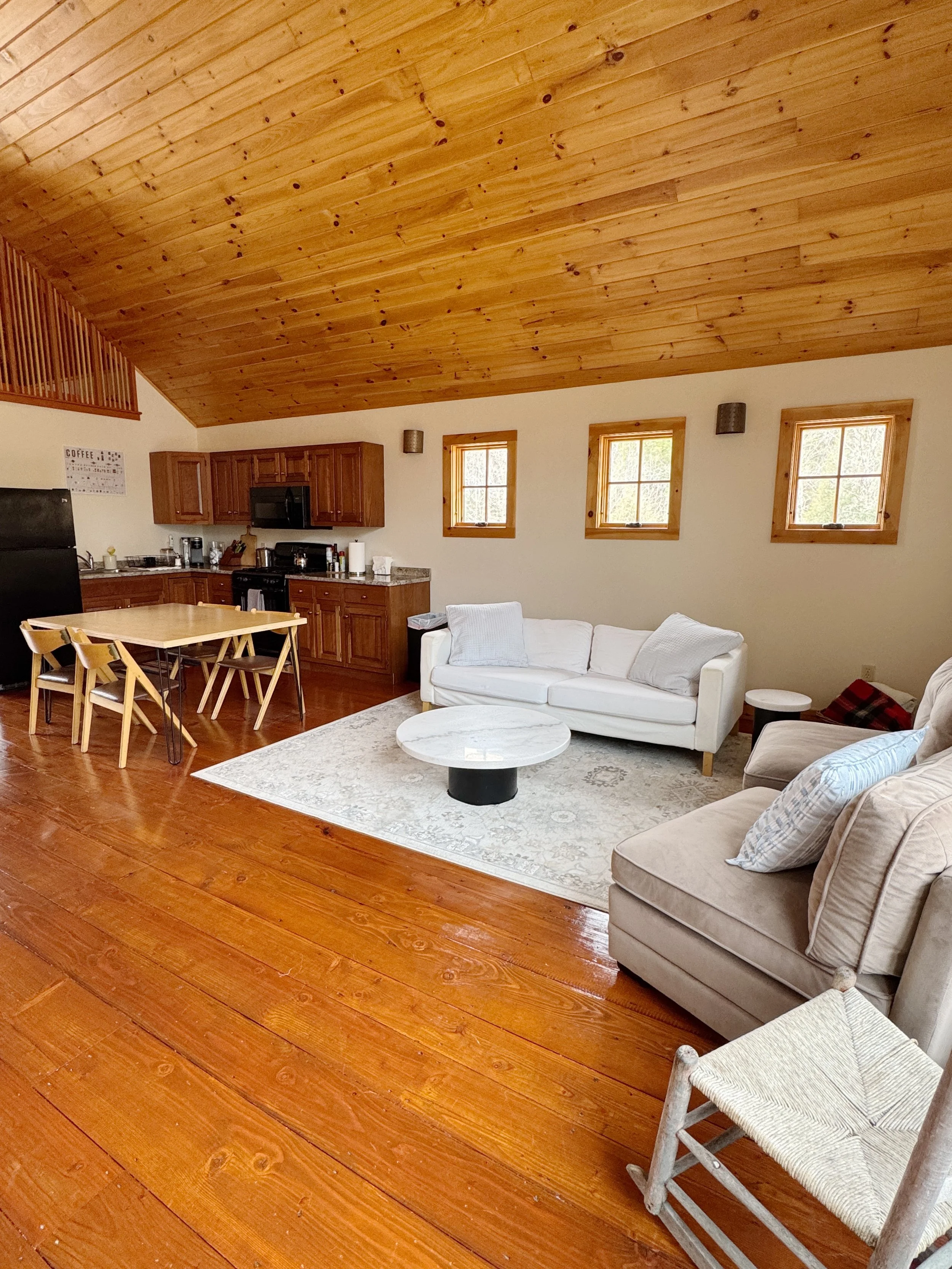 River Stone Barn offers a peaceful retreat with a fully equipped kitchen, spacious sleeping areas, a private bathroom, and cozy living room area. Enjoy modern comforts like high-speed Wi-Fi, plush bedding, and heat/AC while surrounded by nature—perfect for unwinding, creating, or connecting.